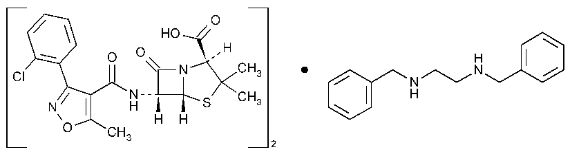 4-Thia-1-azabicyclo[3.2.0]heptane-2-carboxylic acid,6-[[[3-(2-chlorophenyl)-5-methyl-4-isoxazolyl]carbonyl]amino]-3,3-dimethyl-7-oxo-,[2S-(2a,5a,6b)]-,compd.with N,N¢-bis(phenyl-methyl)-1,2-ethanediamine (2:1). (2S,5R,6R)-6-[3-(o-Chlorophenyl)-5-methyl-4-isoxazolecarboxamido]-3,3-dimethyl-7-oxo-4-thia-1-azabicyclo[3.2.0]heptane-2-carboxylic acid compound with N,N¢-dibenzylethylenediamine (2:1) [23736-58-5]. »Cloxacillin Benzathine has a potency equivalent to not less than 704µg and not more than 821µg of cloxacillin (C19H18ClN3O5S)per mg,calculated on the anhydrous basis.