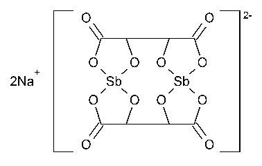Antimonate(2-),bis[µ-[2,3-dihydroxybutanedioato(4-)-O1,O2:O3,O4]]di-,disodium,stereoisomer. Disodium bis[µ-[L-(+)-tartrato(4-)]]diantimonate(2-) [34521-09-0]. »Antimony Sodium Tartrate contains not less than 98.0percent and not more than 101.0percent of C8H4Na2O12Sb2,calculated on the dried basis.